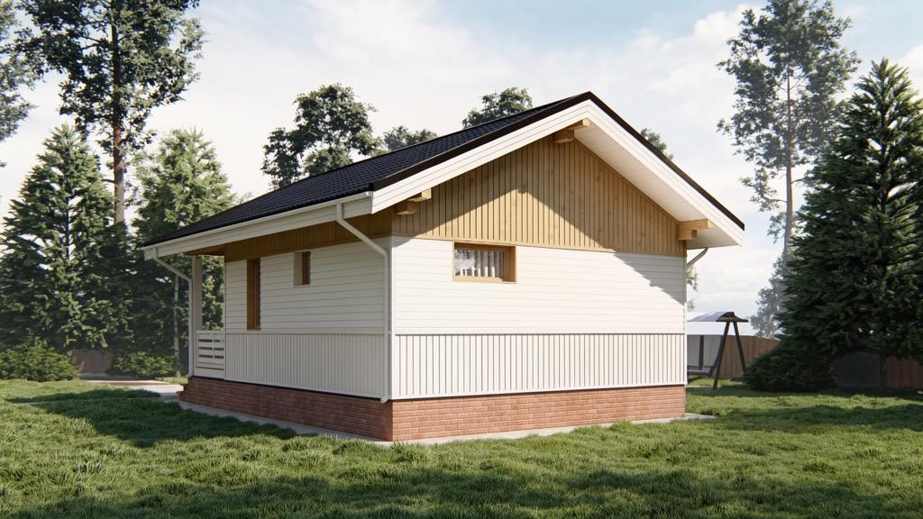 При наличии подъема стен второго этажа, выполнены из бруса. На мансардном этаже фронтоны - имитация бруса;