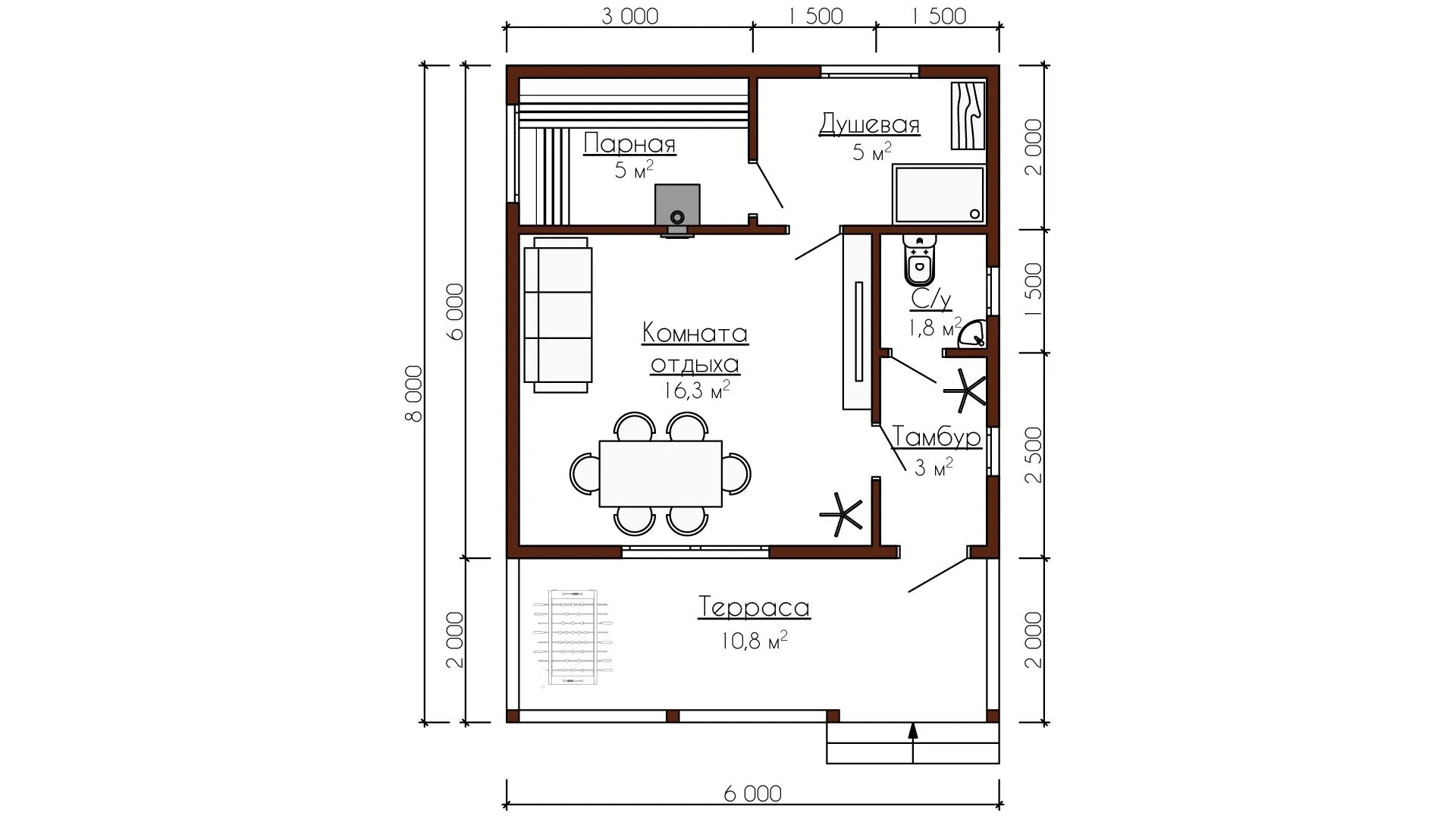 Выполняется из нестроганного бруса 150 х 100 мм, 150 х 150 мм, 150 х 200 мм, в зависимости от толщины каркаса.