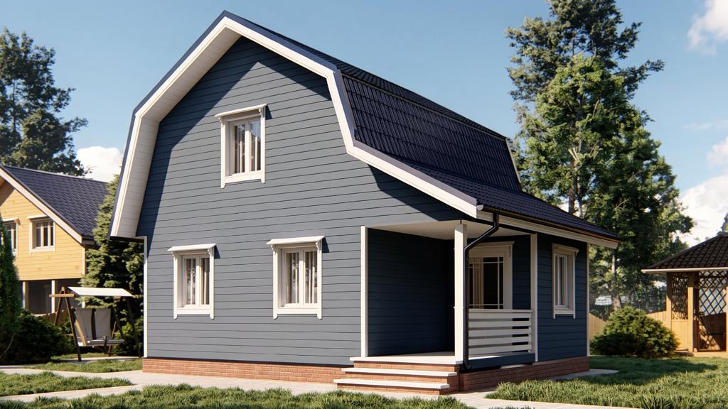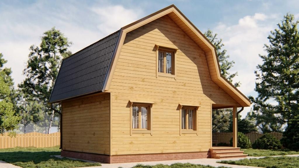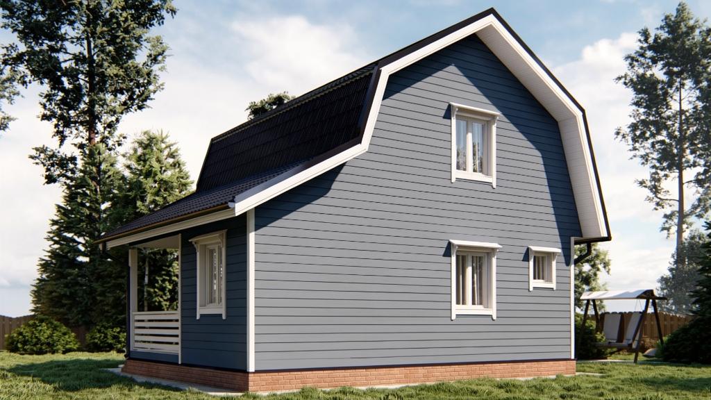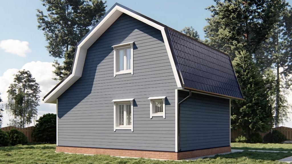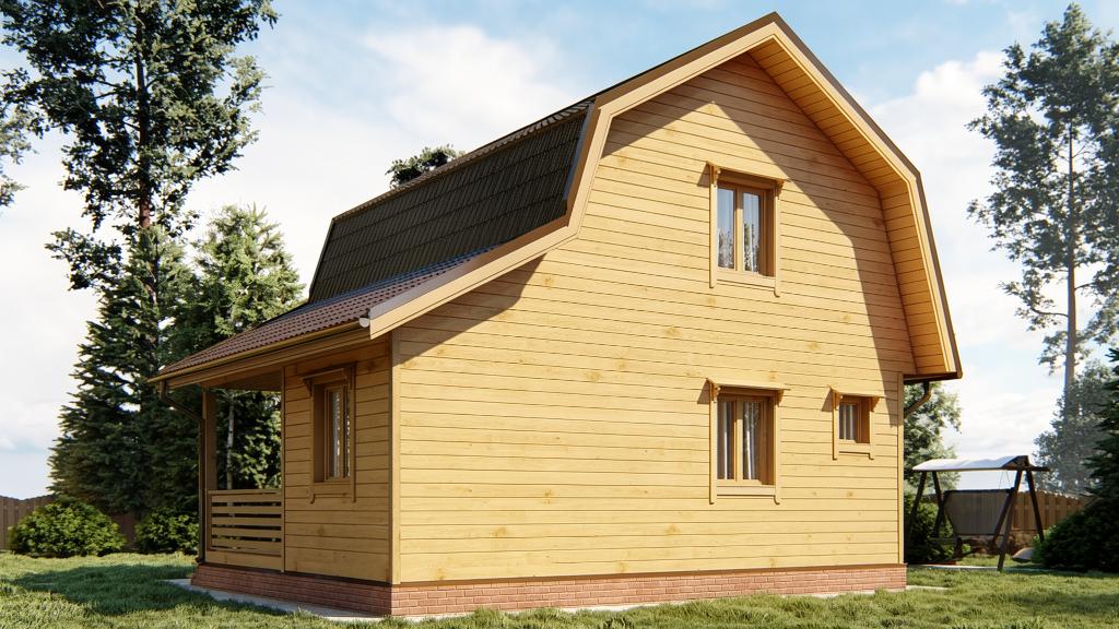 При наличии подъема стен второго этажа, выполнены из бруса. На мансардном этаже фронтоны - имитация бруса;