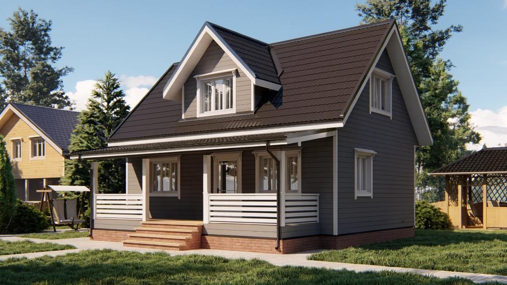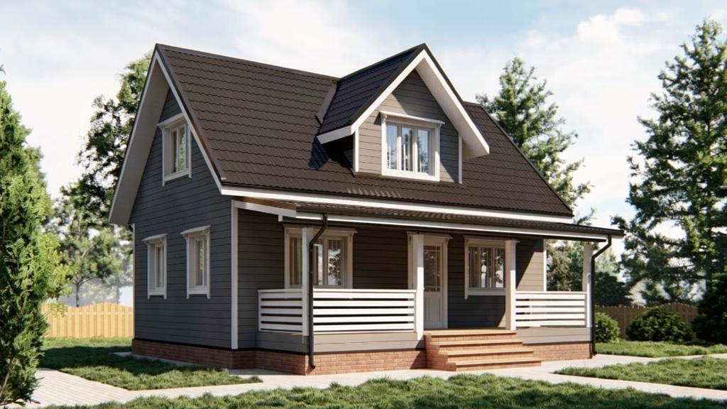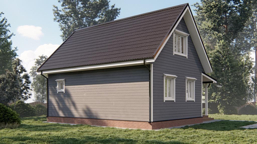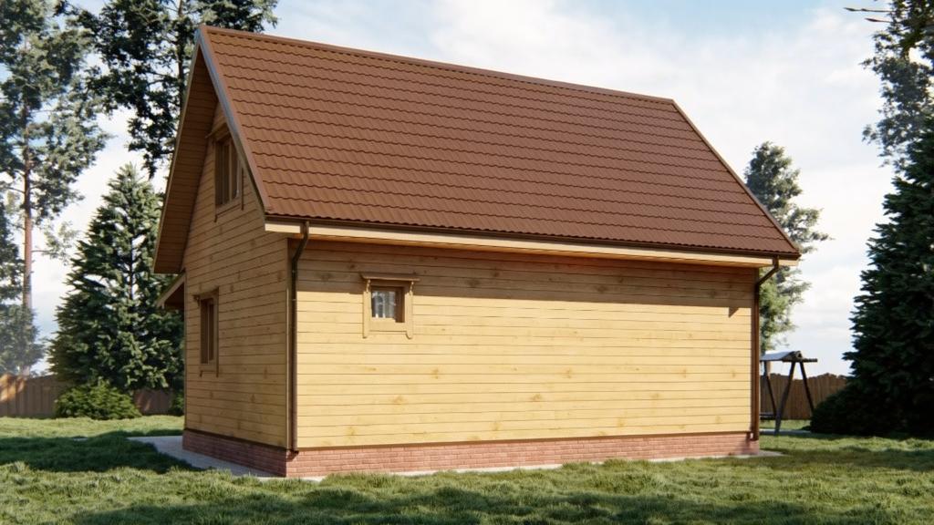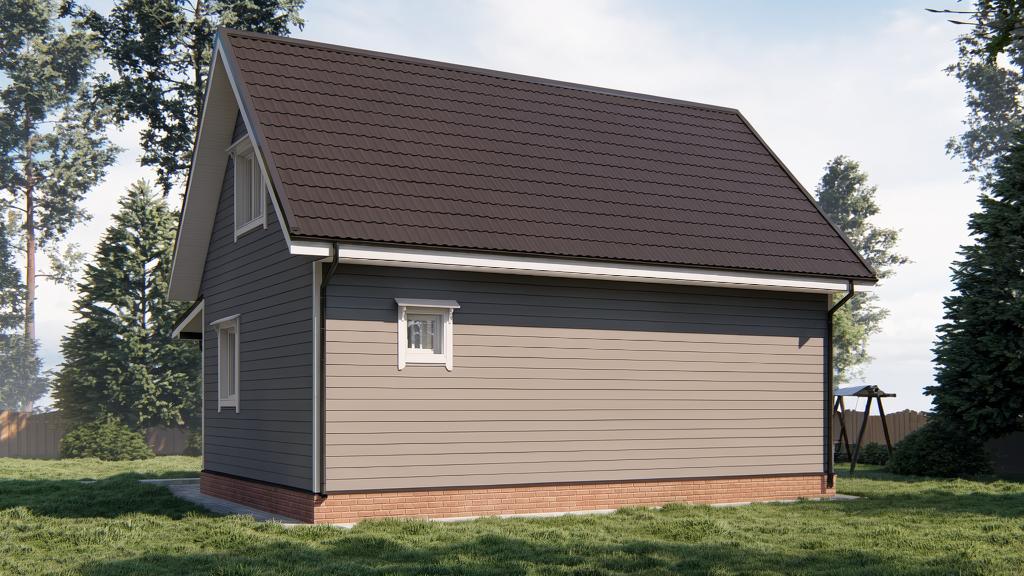 При наличии подъема стен второго этажа, выполнены из бруса. На мансардном этаже фронтоны - имитация бруса;